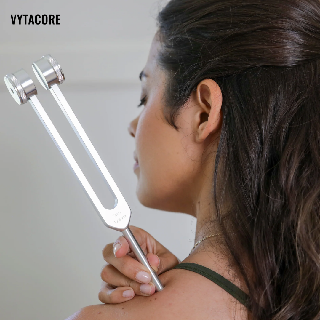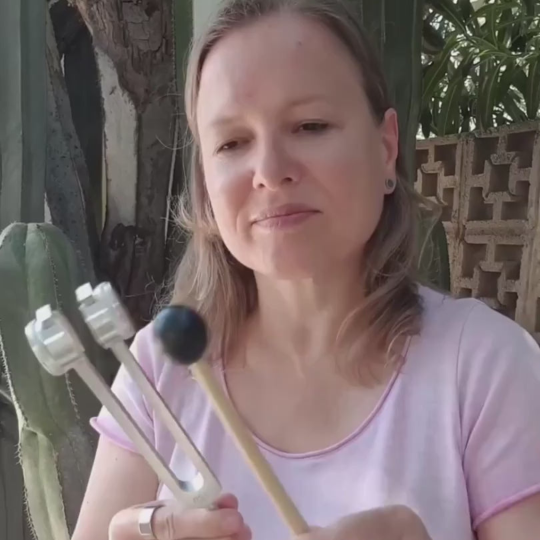 Gently strike the fork and rest the vibrating end on your body. Feel the soothing vibration travel deep, easing tension and restoring balance.